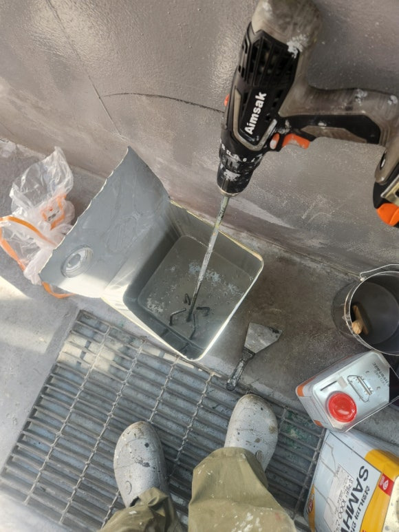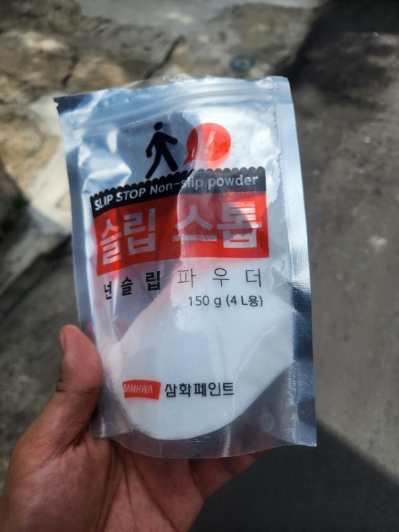 계단 바닥 부분 우레탄 상도 작업 진행 중입니다. 오돌토돌한 거 보이시죠? 이렇게 해놓으면 우레탄 상도가 건조되고도 전혀 미끄럽지 않습니다. 예전에는 미끄럼 방지로 규사를 많이 썼는데, 알갱이가 커서 보기 싫기 때문에 이런 논슬립 가루를 많이 씁니다.논슬립 가루를 쓰지 않고, 미끄럼 방지 테이프를 붙여도 됩니다. 다만 개인적으로는 논슬립 가루가 내구성 측면에서 제일 나은 거 같아요.