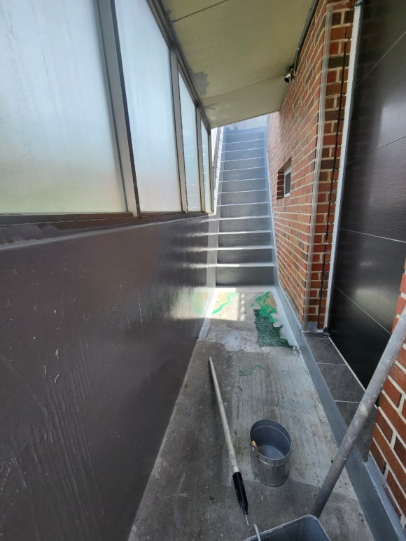 2층 현관문 입구 앞에 있는 바닥은 작업을 안 하려고 했습니다. 2층에 사시는 분이 왔다 갔다 하시기 불편하시기 때문입니다. 그런데 2층 현관문 앞에서 상도 작업을 끊으려니 애매했습니다. 그래서 집 주인분께 2층 거주자분 언제 들어오시는지 여쭤봤습니다. 저녁 늦게 오신다고 하셔서 2층 현관문 앞 바닥까지 전부 우레탄 상도 작업하기로 했습니다. 날씨가 덥기 때문에 우레탄 상도 건조가 빠르기도 하고요, 저녁이면 충분히 시간이 있어서 전부 작업하기로 했습니다.