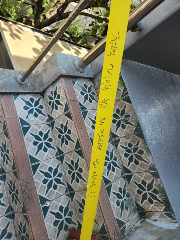 혹시나 누가 올라가서 우레탄 상도가 건조되기 전에 밟지 않도록 테이프 붙여놨습니다. 우레탄 상도야 다시 덧칠하면 그만인데, 신발을 버릴 수 있으니 붙여놓은 겁니다.