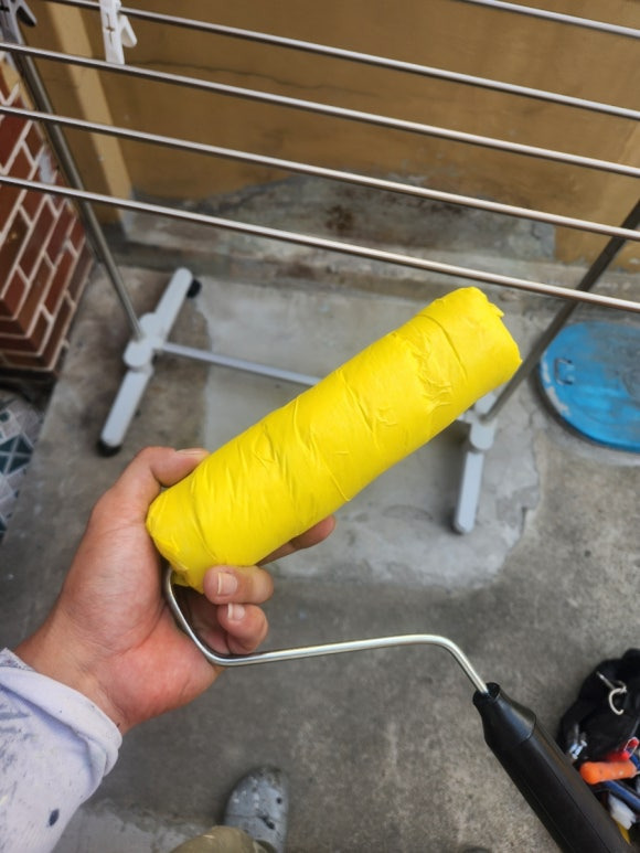 롤러로 넓은 면 작업하기 전에 롤러에 테이프를 한번 감아서 롤러 잔털을 제거해 주었습니다. 우레탄 상도가 끈적거리기 때문에 이렇게 하지 않으면 롤러 털이 많이 빠져서 마감이 깔끔하지 않습니다.