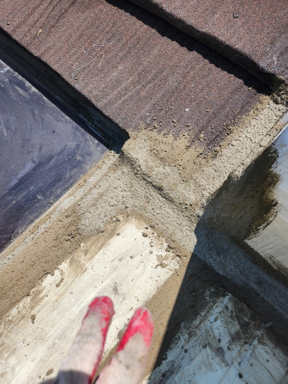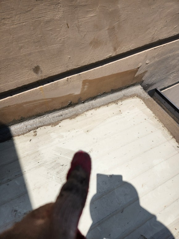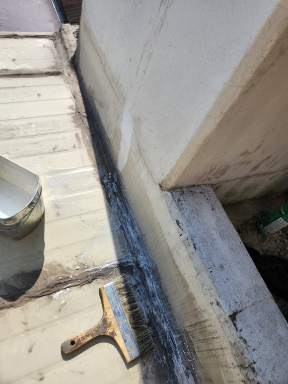 다시 판넬지붕 있는곳으로 돌아왔습니다. 여기가 누수가 심한곳 중에 하나입니다. 누수가 심한곳들은 방수액 섞은 몰탈을 한번 더 발라주었습니다. 여기는 위쪽 외벽 코너까지 방수액섞은 몰탈로 전부 덮어주었습니다.