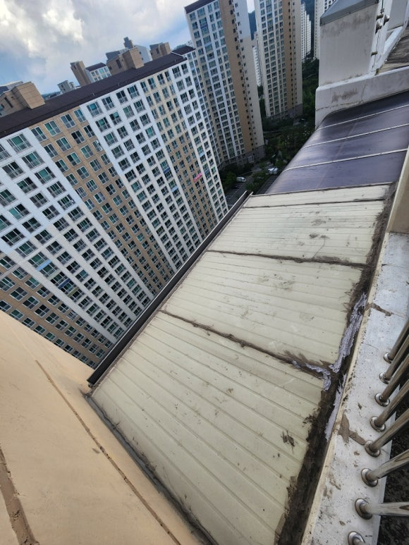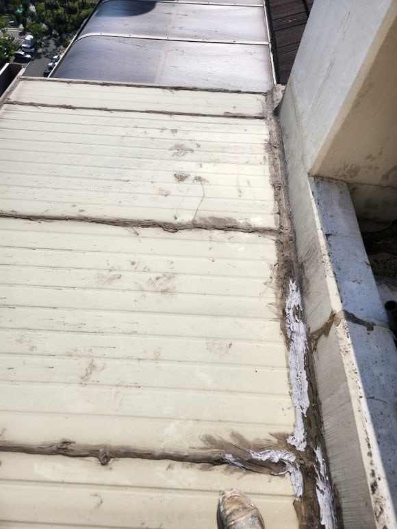 이번 현장의 캐노피(렉산)와 판넬지붕은 건물 외벽과 만나는 부분의 틈새 실리콘이 전부 터져서 누수가 되고 있습니다.