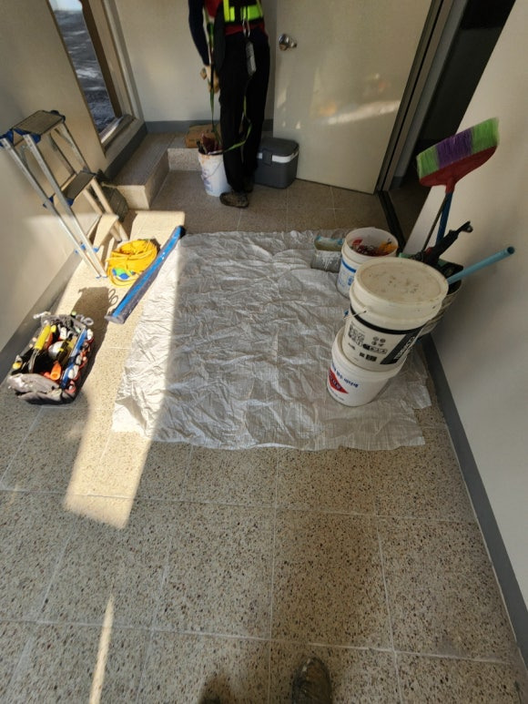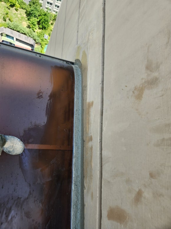 이번 현장의 작업은 먼저 누수부위에 방수액을 섞은 몰탈로 1차 방수처리를 하고요. 실리콘으로 2차방수처리, 마지막으로 실리콘 보호를 위해 우레탄 페인트로 칠하는 과정으로 진행합니다. 실리콘의 경우 렉산에는 렉산전용 실리콘으로 작업할거고 누수부위엔 우레탄 실리콘으로 작업합니다.