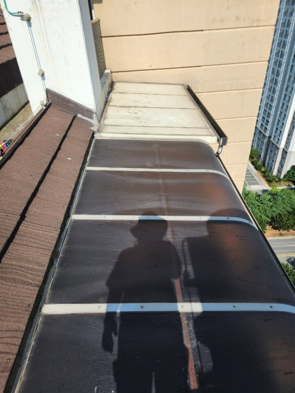 오늘은 테라스에 설치되어 있는 캐노피(렉산)지붕과 창고 판넬지붕 방수공사 하고 왔습니다. 누수가 있어 지난주에 현장실사 다녀왔고, 오늘 누수부위 1차 방수작업 진행하고 왔습니다.