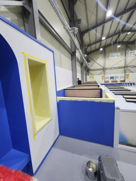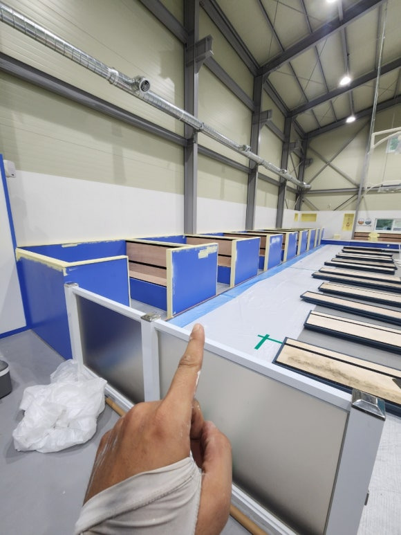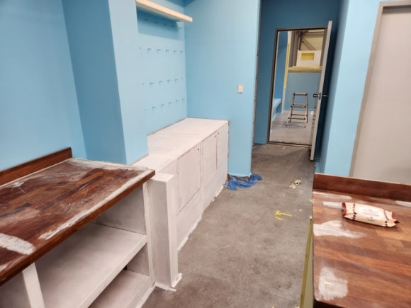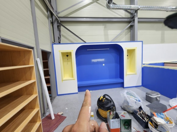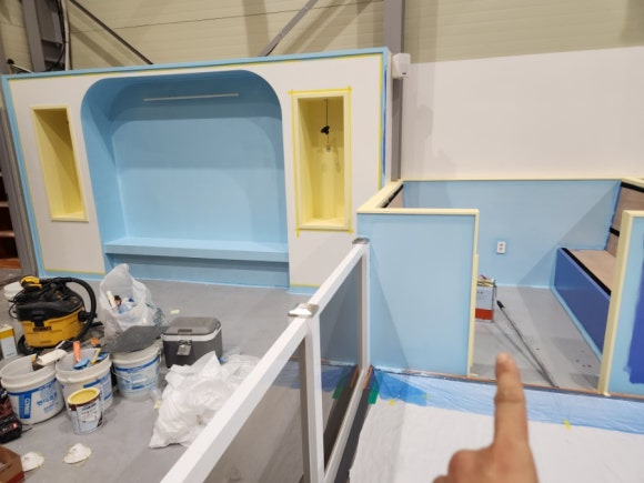 현장에 도착했습니다. 어제 연노랑색 페인트 칠하다가 끝이났고, 오늘 이어서 작업합니다. 파랗게 보이는 벽면은 하늘색으로 칠할거고, 가벽에 둘러져 있는 목재 트림(마감재)는 연노랑색으로 칠을 합니다.