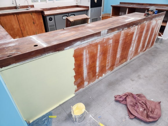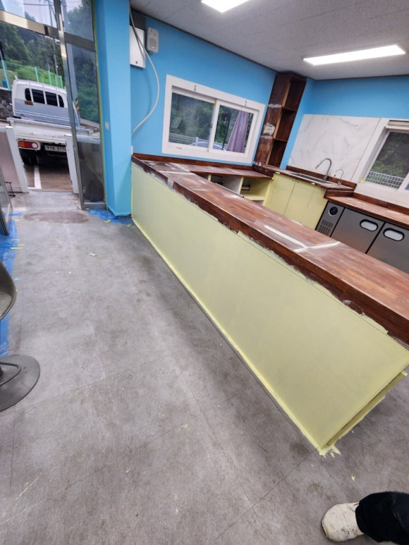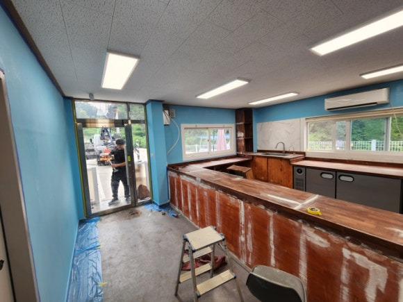 총 4일일정으로 공사중이고 오늘은 3일차 입니다. 하늘색과 연한 노랑색 2가지 색상으로 칠하고 있습니다. 오늘은 메인홀쪽 연노랑색과 하늘색 에나멜 페인트 작업, 주방 벽체 하늘색 수성페인트를 칠하고 왔습니다.