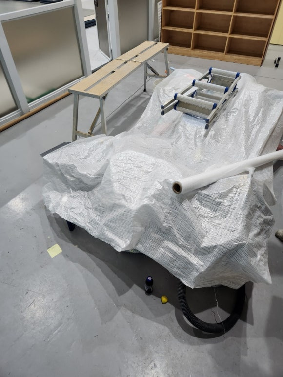 포토존 양 옆으로 들어가있는 수납장(등박스)부터 작업 합니다. 테두리를 반듯하게 칠하기 위해 마스킹 테이프로 보양 후 작업중입니다.