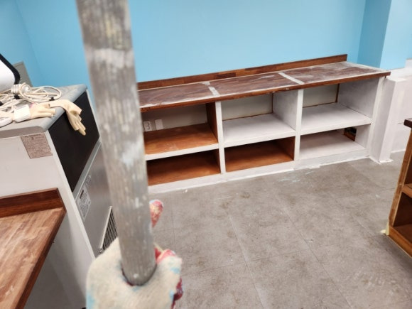 오늘은 메인홀쪽 테이블석 가벽 페인트칠과 애견카페 주방 벽체, 수납장을 연노랑으로 칠하는 부분까지 마무리 해야 합니다. 거의 쉬는시간 없이 열심히 일하고 왔네요. 먼저 애견카페 메인홀쪽부터 작업 시작합니다.