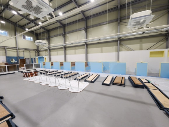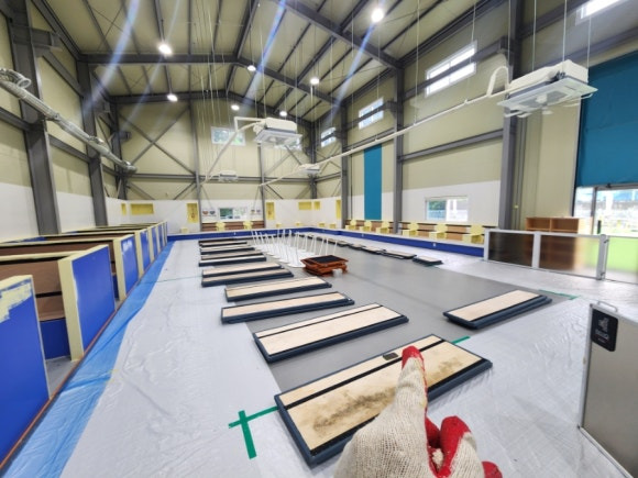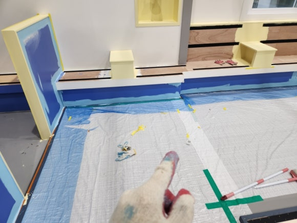 메인홀 바닥은 푹신한 매트가 깔려있습니다. 붙박이 의자등과 만나는 부분에는 플라스틱 마감재로 처리되어 있고요. 플라스틱 마감재는 칠이 묻으면 안되므로 마찬가지로 보양하고 작업하고 있습니다. 마감 라인을 깔끔하게 작업하기 위한 목적도 있습니다.다른곳은 바닥작업(데코타일, 타일)을 하는데, 매트가 깔린 이부분은 바닥을 그대로 씁니다.