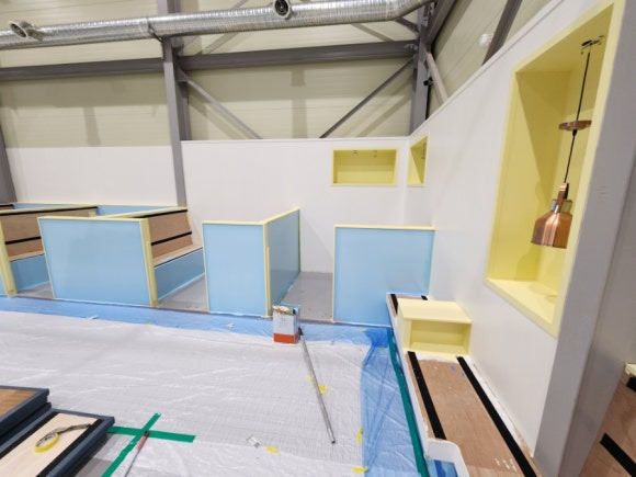 테이블석 안쪽 가벽은 하늘색과 연노랑색의 경계가 거의 없습니다. 바깥쪽은 연노랑색 부분이 살짝 튀어나와 있어 바로 붓질작업이 가능한데 여기는 거의 한면처럼 되어 있네요.
